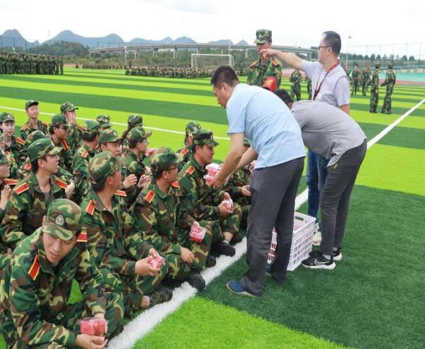 在活动中,朱红琼书记与傅东平经理用暖心的话语对新生表示亲切的慰问,鼓励同学们在军训中要发扬不怕困难、互帮互助的精神,同时带领员工干部为新生发放水果、矿泉水等慰问物资,用实际行动展现对新生的关爱。随后,公司各员工组织的代表为新生们进行了慰问表演,以缓解他们军训的疲劳,并与新生们进行了友好互动,让他们感受到公司的热情与温暖。
