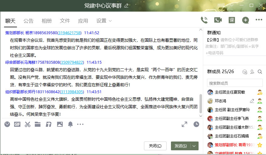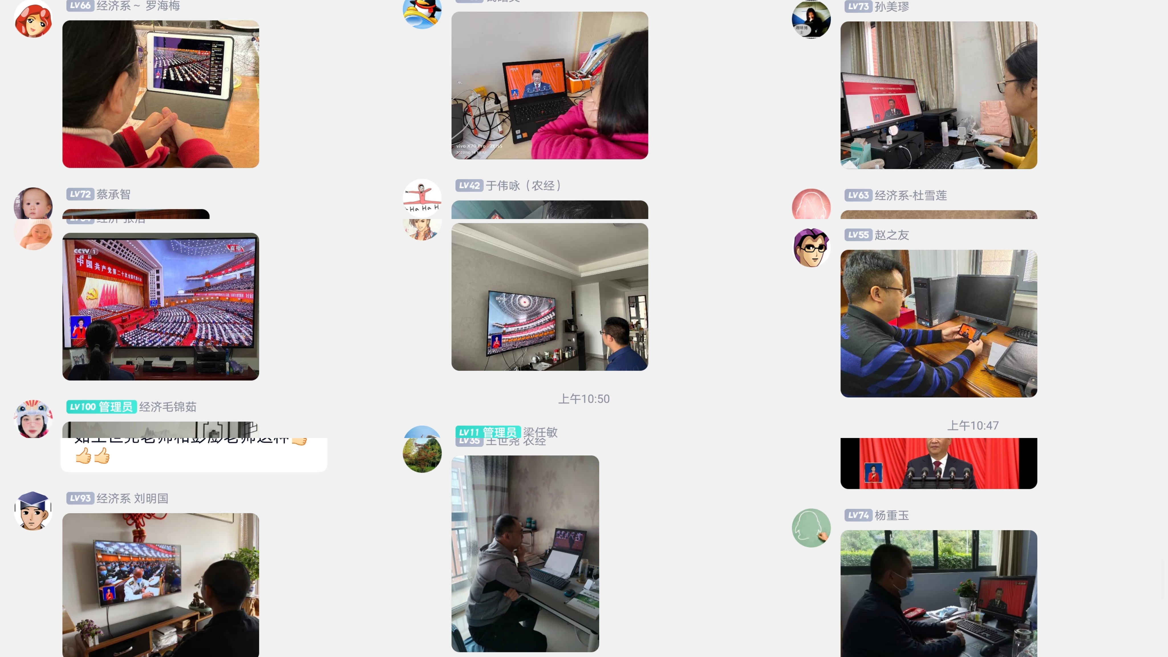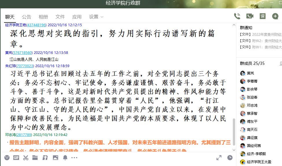 公司居家自行观看开幕会的教职工也在工作群展开热议:党委副书记赵之友:“蓝图即将展开,我们要在岗位上踔厉奋发,笃行不怠,努力为祖国现代化建设做出应有的贡献。”;党委副书记邓志鸿:“报告主题鲜明,内容全面,强调了科教兴国、人才强国,对未来五年前进道路指明方向。尤其提到了三个务必:务必不忘初心牢记使命,务必谦虚谨慎艰苦奋斗,务必敢于斗争善于斗争。”;本科生一支部支部书记王艳:“深化思想对实践的指引,努力用实际行动谱写新的篇章。”;公司办公室主任黄岚:“报告再次提到江山就是人民,人民就是江山!强调了中国共产党领导人民打江山、守江山,守的是人民的心。”