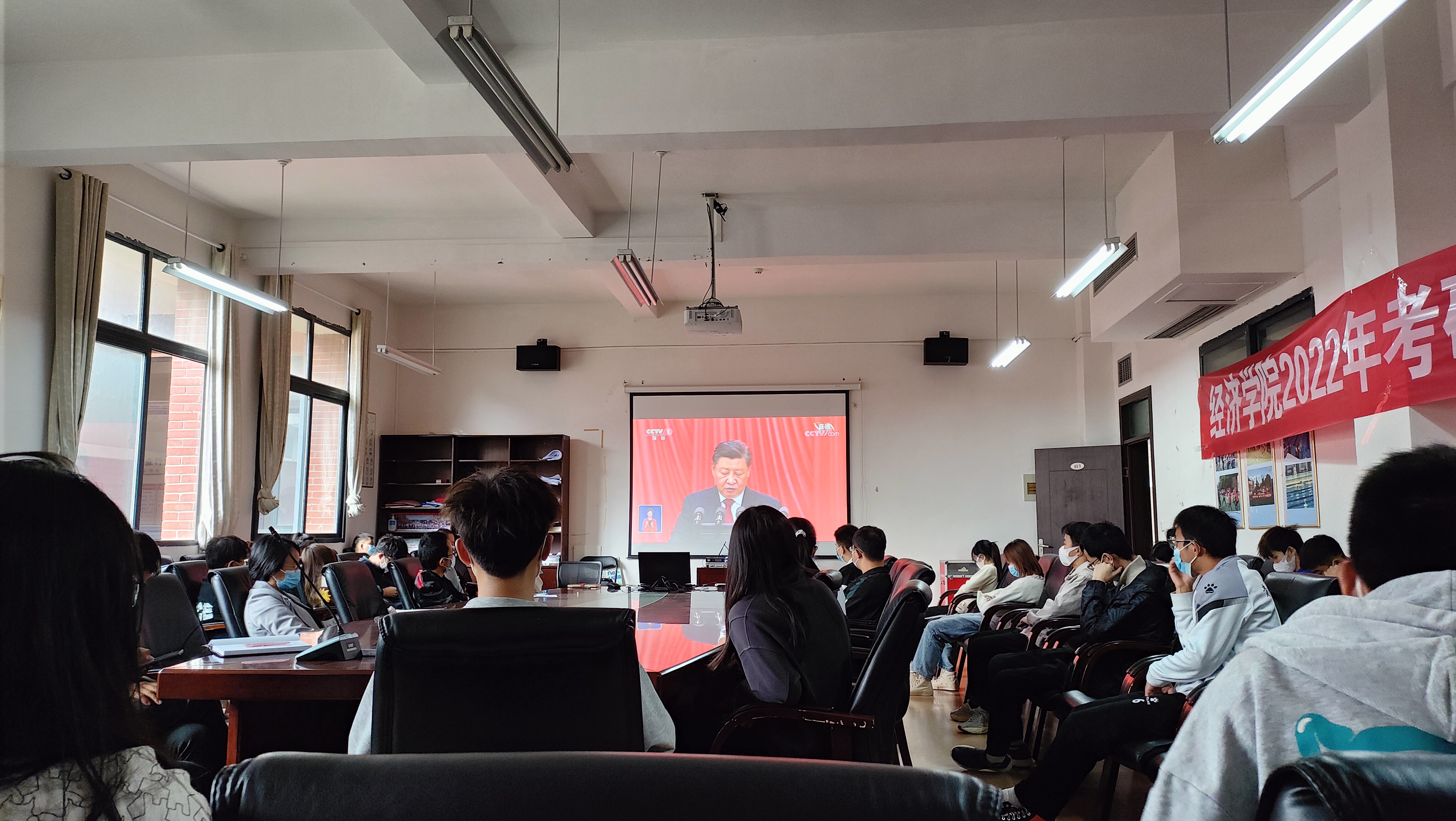 经济公司党委书记朱红琼带队部分在校值守教职工和员工在明德楼413集中收看