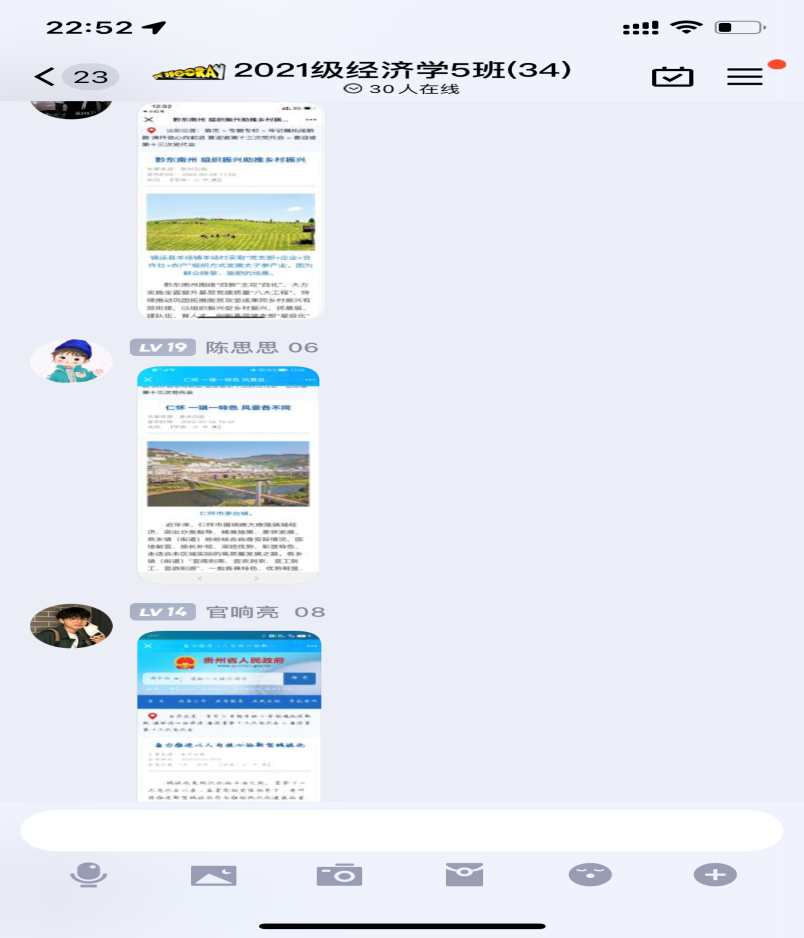 此外,同学们还对《剑河策马扬鞭 奋力跨越》《台江浓墨重彩绘愿景》《雷山景美人和日子甜》等喜迎省第十三次党代会相关主题进行了学习,充分了解到贵州各县为贵州发展所做出的努力。学习之后,大家纷纷表示将认真学习贯彻贵州省第十三次党代会精神,深刻领会和把握党代会精神实质、核心要义,切实把思想和行动统一到会议精神上,奋力谱写多彩贵州现代化建设新篇章。