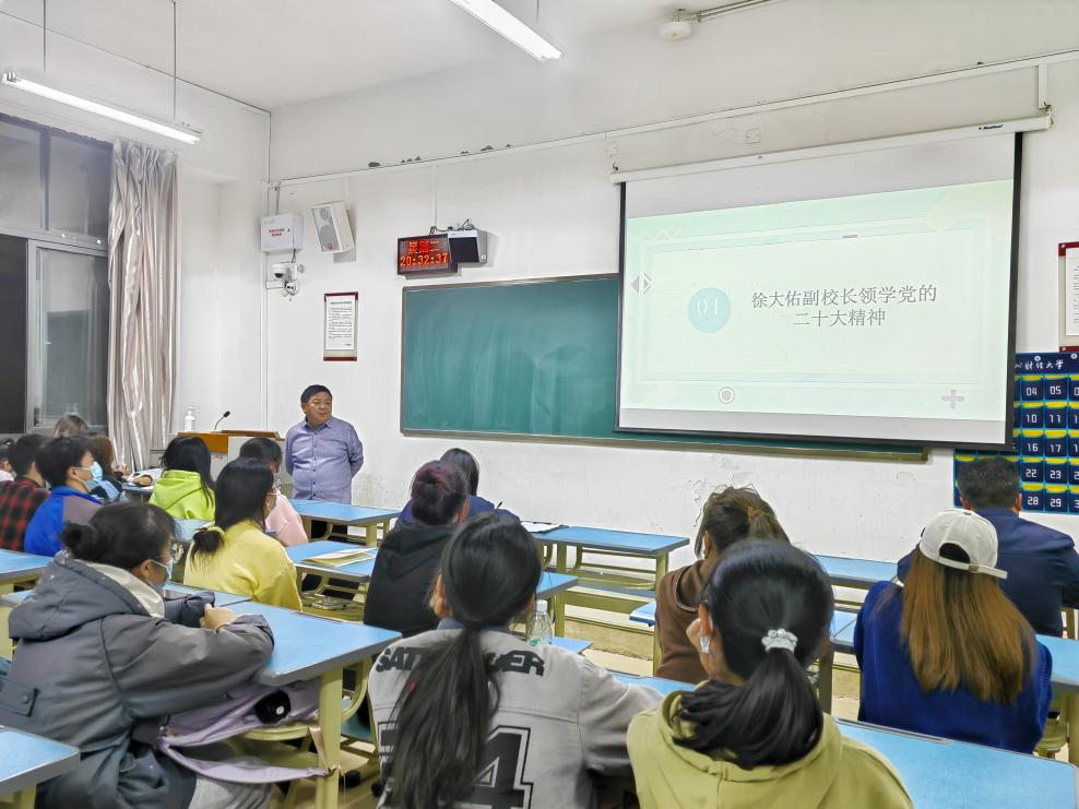 2022年11月8日晚上,徐大佑副董事长赴博学楼1-14为2021级经济1班同学作党的二十大精神宣讲。经济公司党委副书记赵之友,williamhill官网团委彭梦娜老师以及2021级经济学1班全体同学参与了此次宣讲会。