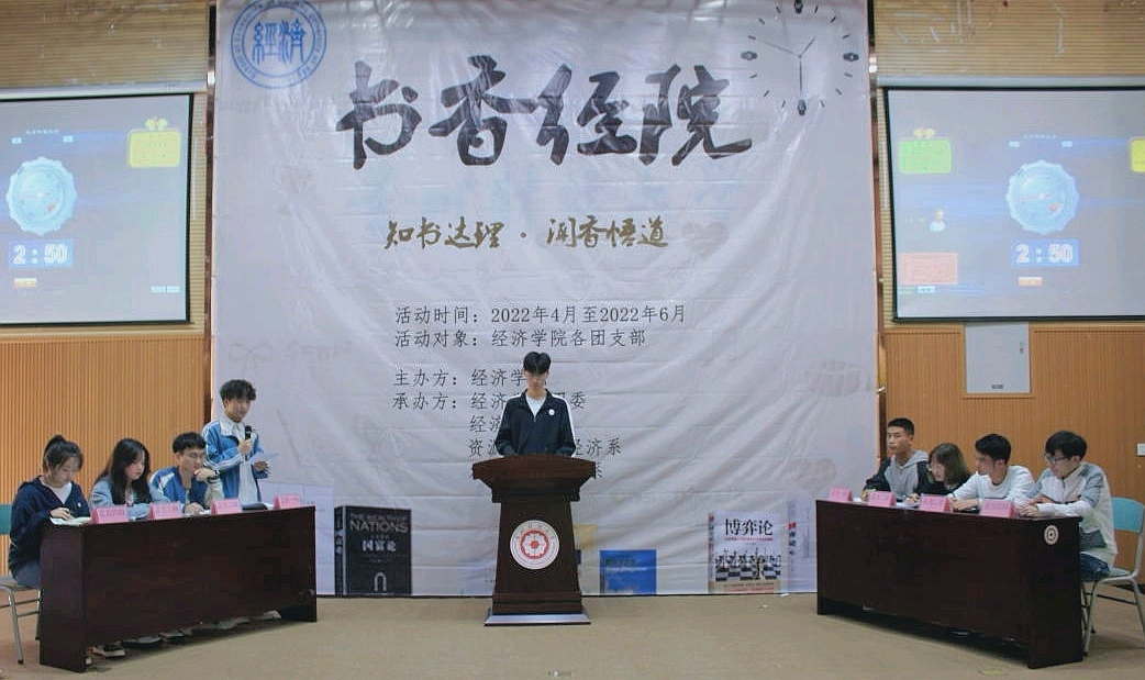2022年4月26日下午,williamhill官网在崇德楼报告厅举办2022年度“书香经院”系列活动(第二场)。williamhill官网经济系岳仁崇老师、资源与环境经济系任亚运老师、农林经济管理系张连华老师、团委负责人魏来老师、马克思主义公司研究生、校辩论赛队长袁宇同学出席本次活动并担任评委。20级农林班、20级经济学1班、21级经济学类6班、21级实验班共计100名同学共同参加了本次活动。