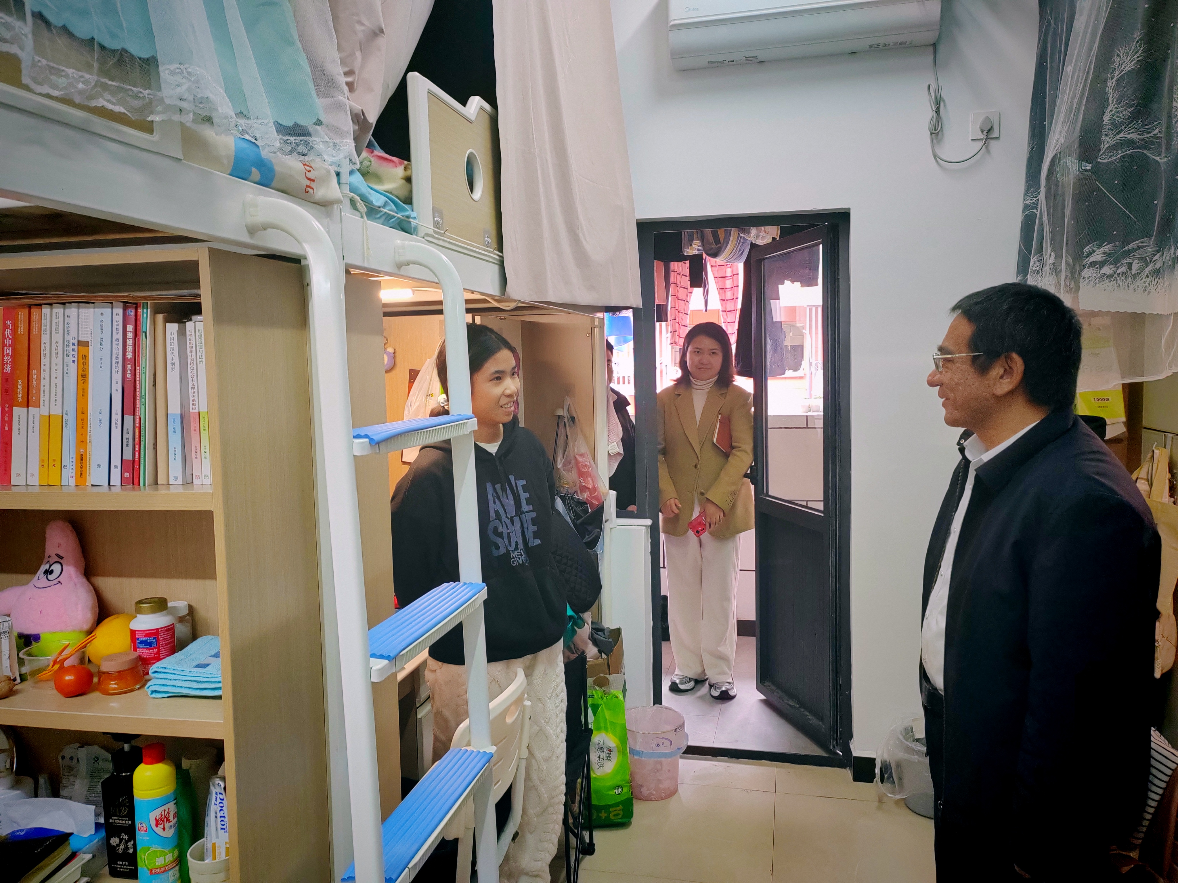 缪坤和董事长实地了解文心苑3经院之家“一站式”员工社区、“健身之家”建设情况,并走进“党员示范寝室”与同学们亲切交谈,了解员工在校学习、生活情况,给正在备考国考和研究生考试的员工加油鼓劲。