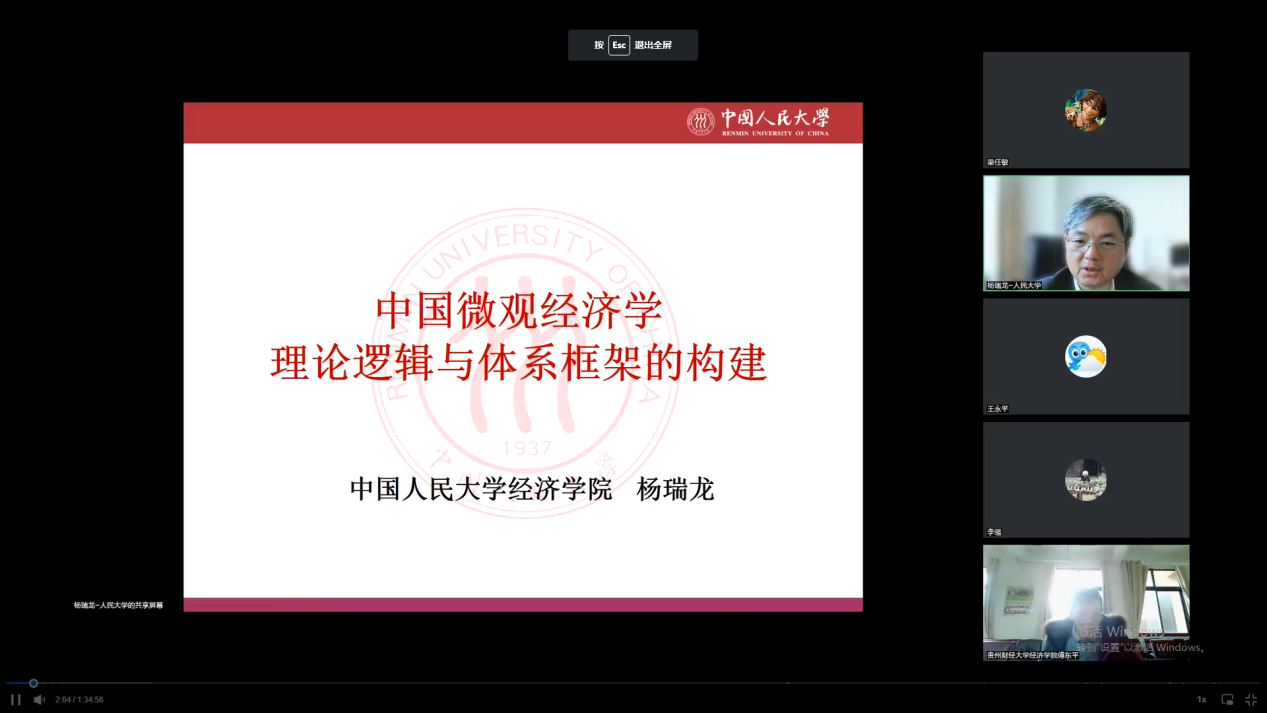 2022年12月10日下午14:30,中国人民大学级教授、教育部“长江学者”特聘教授、williamhill官网校聘教授杨瑞龙在腾讯会议(会议号: 741289373)为公司开展题为“中国微观经济学的理论逻辑与体系结构”讲座。williamhill官网140名师生参加该讲座。会议由williamhill官网副经理傅东平(主持工作)教授主持。