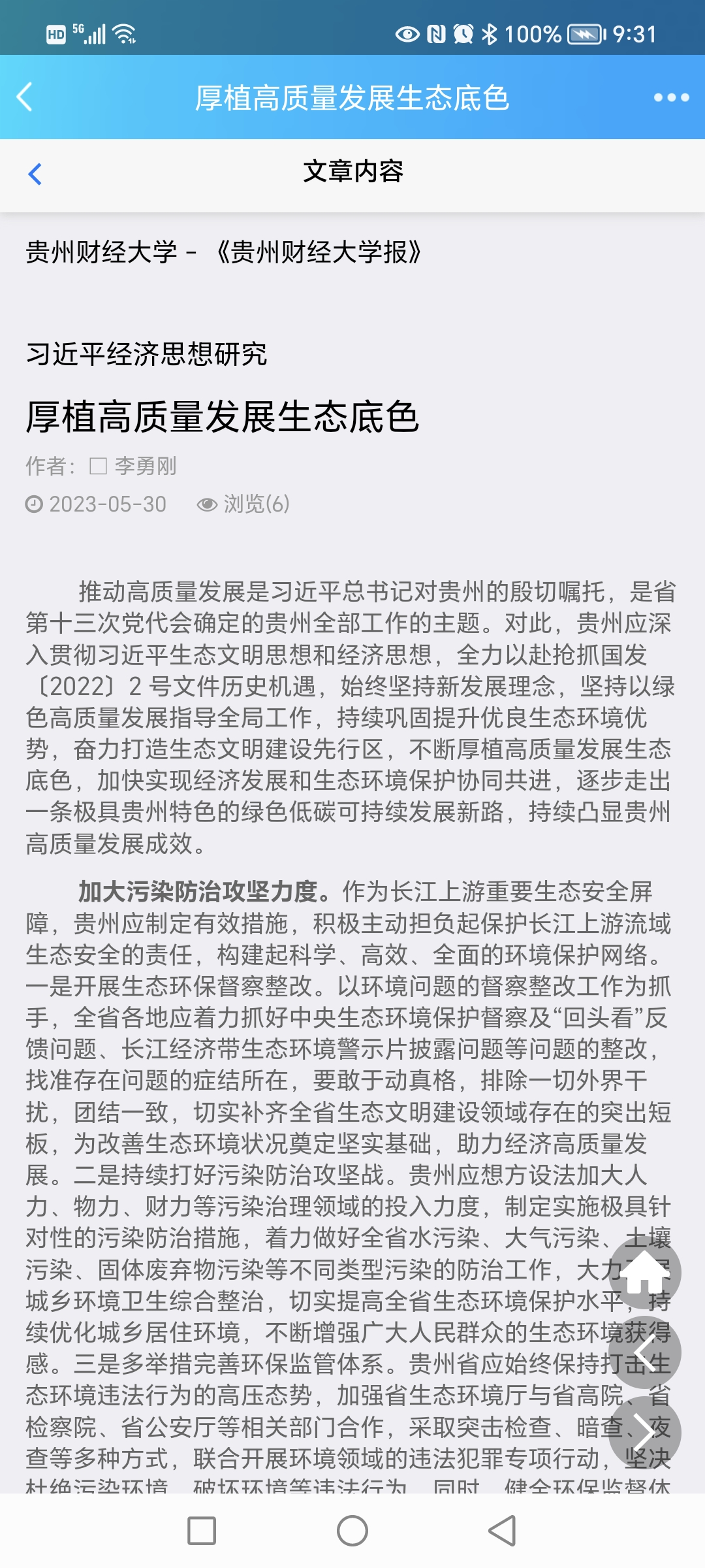 鼓励人民群众广泛参与。良好生态环境是最普惠的民生福祉,贵州应利用各种渠道鼓励广大人民群众参与生态环境保护,不断壮大爱绿、植绿、护绿的力量。一是继续开展“贵州生态日”“生态环境月”等系列活动。通过举办“生态贵州”演讲情景剧比赛、“生态文明”论坛、环保公益艺术作品展、生态诗文朗诵、开放环保公共设施等系列活动,引导广大人民群众参与到环境保护活动中,努力营造生态文明共建共治共享的良好局面。二是加强生态文明宣传教育。充分利用纸质媒体、互联网、广播电视等传统意义上的媒体平台,以及数字广播、移动电视、数字杂志、数字电视、互联网、桌面视窗等新兴媒体平台进行丰富多彩的生态文明科普宣传和舆论引导,营造浓厚的保护生态环境的氛围,提升人们群众的生态意识、节约意识和环保意识,让文明理念内化于心外化于行,引导人民群众将广泛“生态共识”转化为积极“生态行动”,共创绿色低碳美好生活。三是养成生态环境保护观念。安排专门工作人员在社区、街道、休闲街、公园等区域发放环境保护传单、环境保护书刊、环境保护知识手册等相关材料,引导人们更多关注身边的生态环境问题,使广大人民群众真正了解生态环境保护与其身体健康和生活质量的关系,提高人们保护环境的思想境界,逐渐养成生态环境保护观念,也间接督促当地政府将环境保护工作放到更为重要的位置。