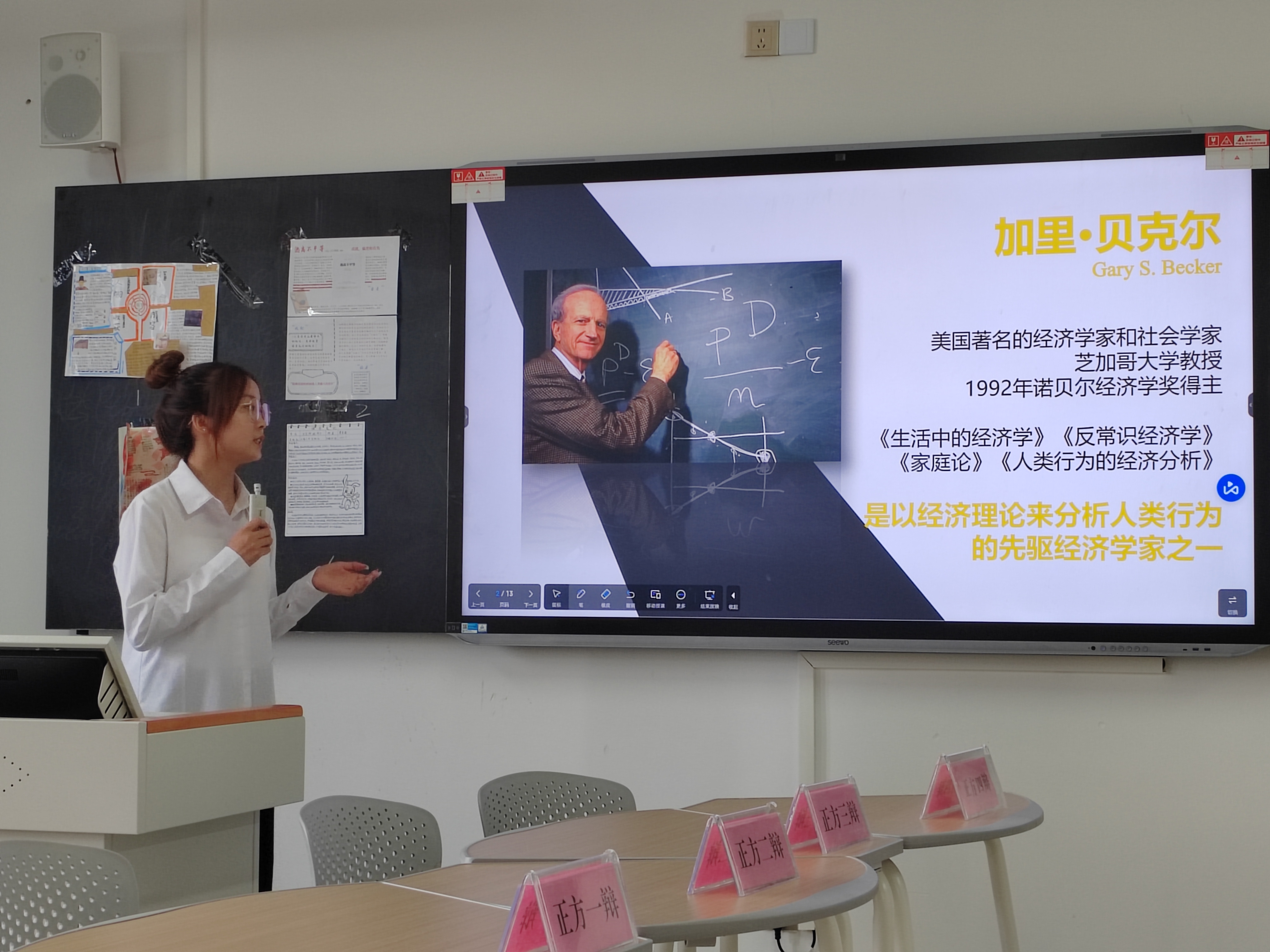 第一项活动:“经典有约”读书分享会。选手们分享的书目有《生活中的经济学》《江村经济》《薛兆丰经济学讲义》等。选手向大家介绍的《生活中的经济学》可以帮助同学们理解经济学原理在生活中的应用,从而更好地理解和应对经济现象。第二位选手向大家介绍的《江村经济》是费孝通先生的代表作之一,被广泛认为是社会学和人类学的经典之作。选手认为书中详细描述了当时中国农民的消费、生产、分配和交易体系,并探讨了这些经济体系与特定地理环境以及社区社会结构的关系,可以更好的帮助同学们了解独特的经济消费环境。